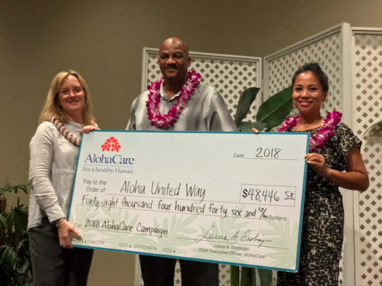 A big mahalo to Aloha Care for an amazing Aloha United Way workplace campaign. We want to thank Laura Eslinger, CEO and this year’s 2018 Coordinators: Esther Underwood (HR Director), Darla Decoito (HR Benefits Manager) and Yu Lin (Clinical Ops). They set their campaign goal at $15,000 and with a corporate match and a series of FUNdraisers, exceeded their goal by raising $48,446. AUW-some!