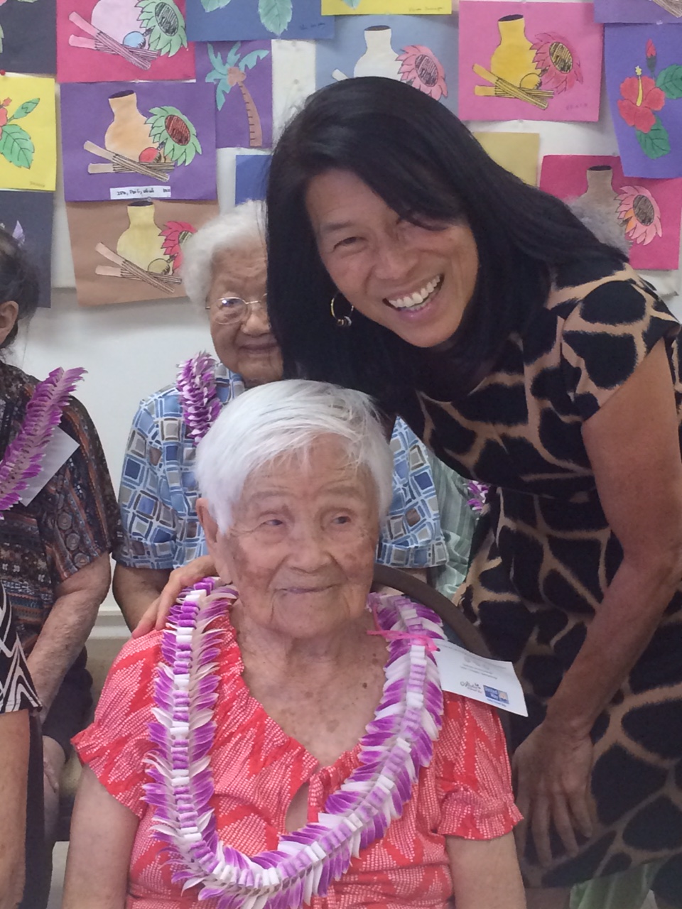 Aloha United Way kicked off a new initiative called Random Acts of Aloha, which mobilizes the caring power of our local community to demonstrate the impact of giving back and encourage individuals and businesses to participate in AUW’s annual campaign, which kicks off this August. AUW received lei as a donation from local company Aloha Island Lei, which were distributed this afternoon by volunteers from AUW’s Society of Young Leaders to over 100 elderly individuals at Moiliili Community Center and Palolo Chinese Home as a surprise and as part of Random Acts of Aloha.At Moiliili Community Center, the surprise gifts of lei were especially timely as their oldest participant, named Shizuko, had just celebrated her 102nd birthday a few days prior. At Palolo Chinese Home, day care, nursing, and care home participants were thrilled and honored to receive the beautiful lei. Both senior groups welcomed the lei with hugs, cheers and in some cases, even happy tears.