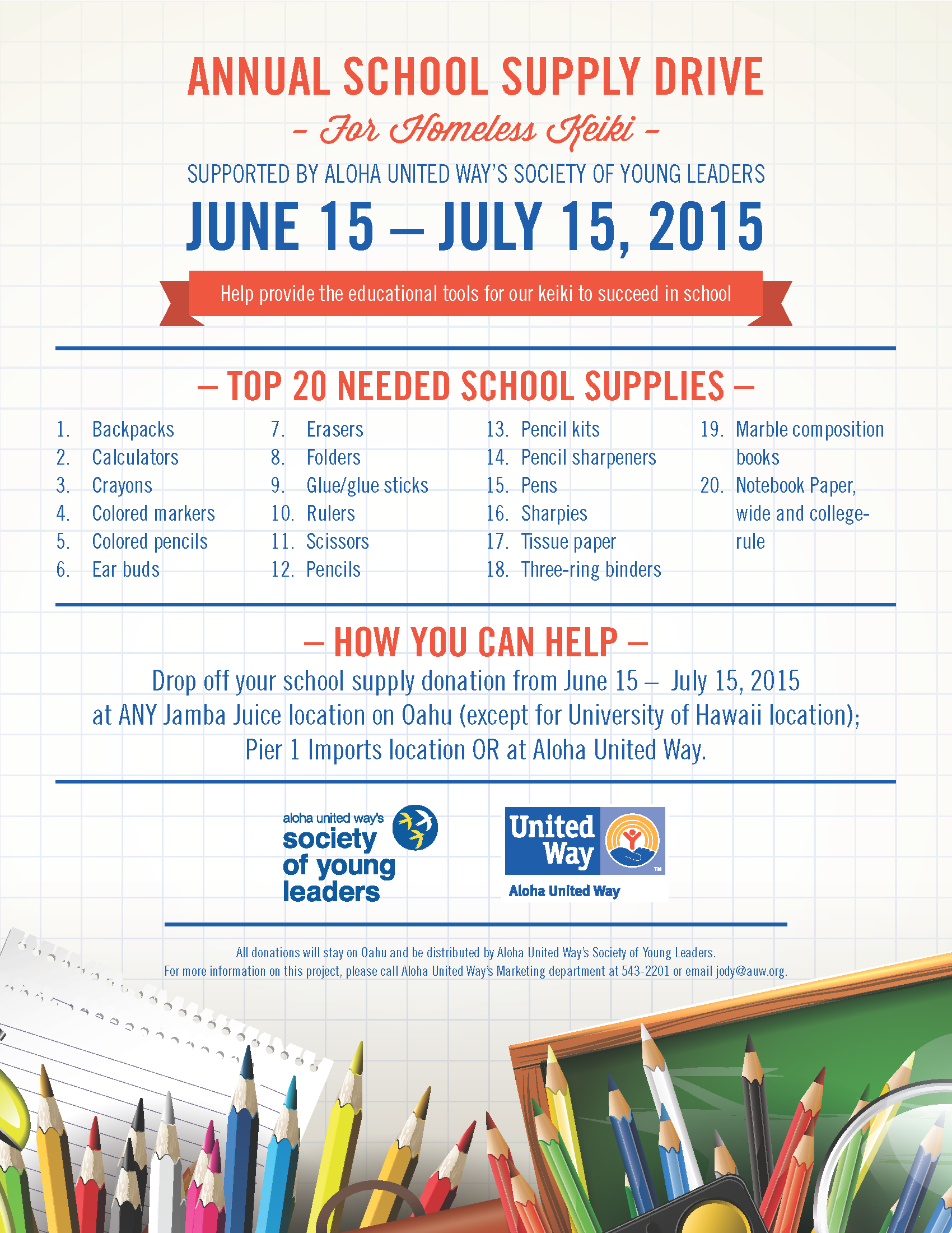 It’s that time of year again when school ends and Aloha United Way's Society of Young Leaders begin the collection of school supplies for homeless students for the start of the new school year. This year, public school students go back on July 29 and the Society of Young Leaders would like to ensure that when they return, they all have the appropriate educational tools that they need to start the year right.