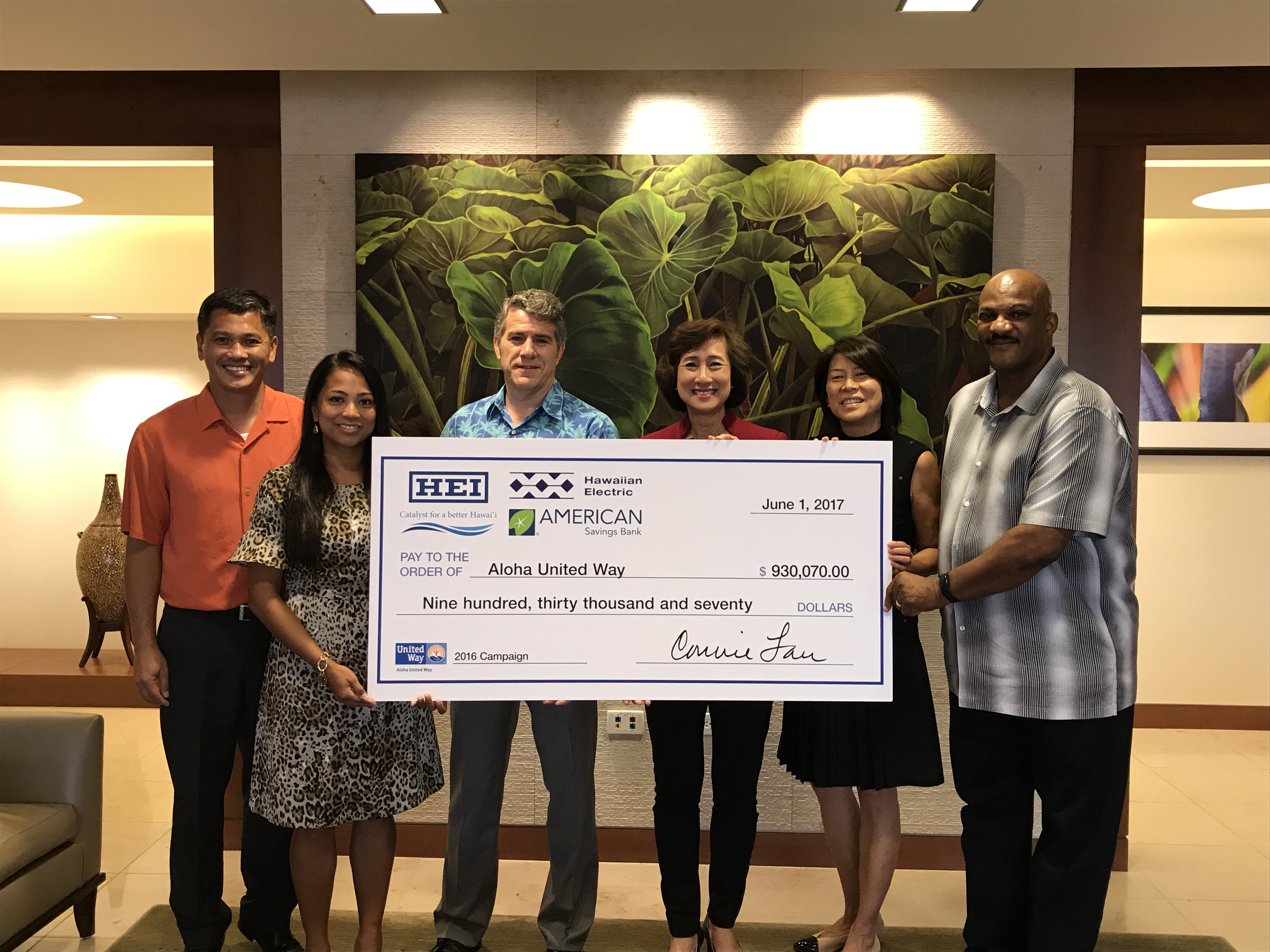 Today, Aloha United Way (AUW) received a donation check for $930,070 from HEI to help support AUW's 2016 campaign.   HEI is the parent company of Hawaiian Electric and American Savings Bank.  The AUW campaign was kick-started by a $300,000 donation from the HEI Charitable Foundation, and fueled by a year-long fundraising campaign by Hawaiian Electric employees and retirees, raising more than $518,000.  American Savings Bank employees also generously supported AUW through their Kahiau annual giving campaign. We are truly grateful for their generosity and continued support of Aloha United Way and our community.