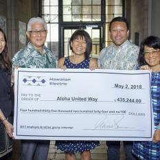 Photo caption:  A fundraising campaign by company employees and retirees during Hawaiian Electric’s 125th anniversary year raised more than $435,000 for Aloha United Way. Left to...