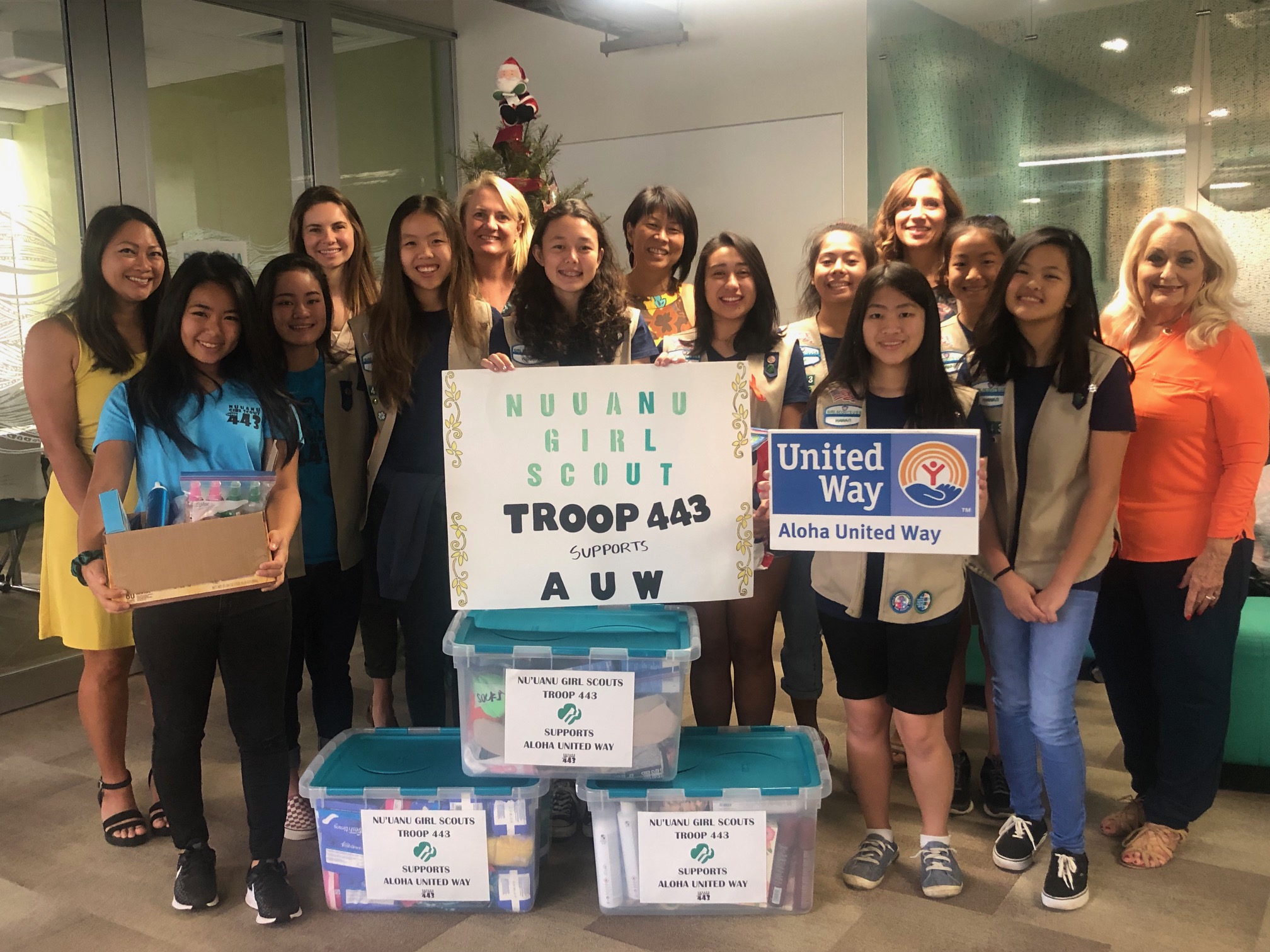 This morning members from Nuuanu Girl Scouts Troop 443 came over to drop off and deliver goods from their holiday toiletry drive. Collected items included feminine products, underwear, soap, shampoo/conditioner and razors. The items collected will go to support girls who are experiencing homelessness.